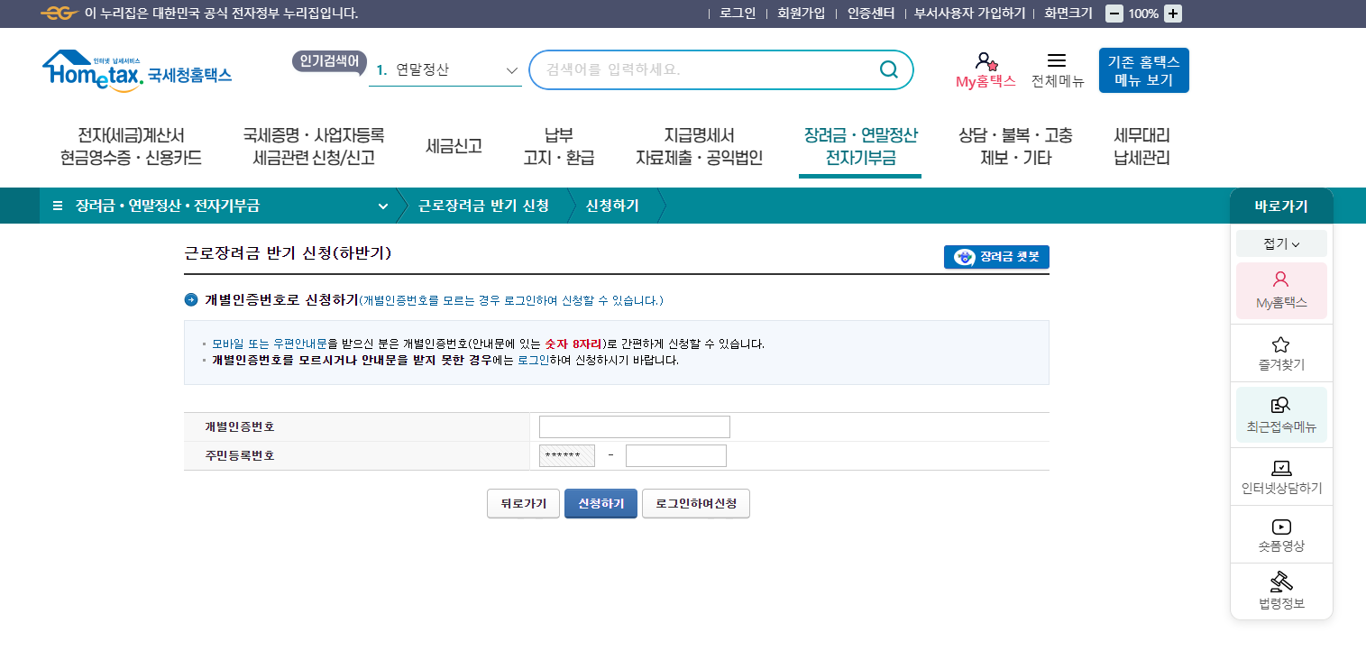 위 버튼을 눌러서 근로장려금 신청페이지에 들어간 후 개별인증번호와 주민등록번호 뒷자리를 누릅니다. 계좌번호와 연락처를 입력하면 근로장려금 신청하실 수 있습니다.