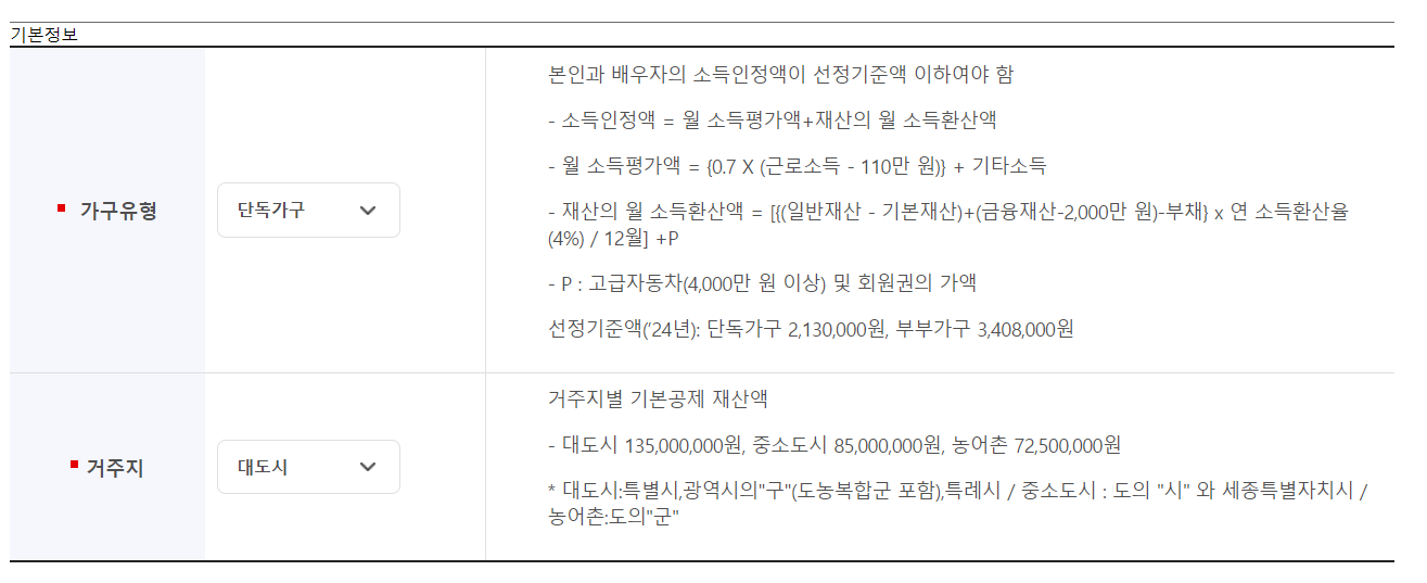 기초 대한민국 국민 중 가구 소득인정액이 기준에 맞아야 수급받을 수 있습니다. 소득인정액은 근로소득, 사업소득, 금융소득, 부동산 등을 소득으로 환산한 것입니다.