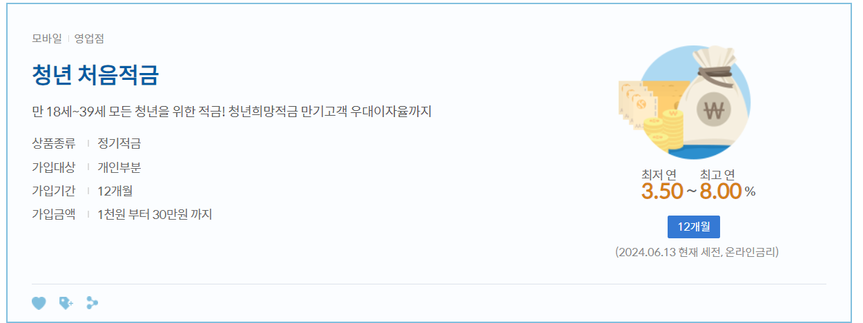 신한은행 42주년을 앞두고 신한은행 청년 처음적금을 출시했습니다. 최고 금리는 8%이며 청년들의 금융지원 강화를 위해 지원해주고 있습니다. 한시적으로 판매하는 것은 10만좌 한도로 판매할 예정입니다. 빠르게 신청하고 싶으시다면 아래에서 신청해보세요.