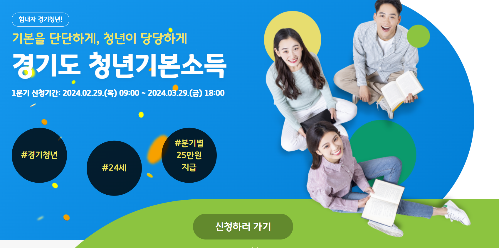 경기도 거주 24세 청년을 위해 1년에 100만원 받을 수 있는 1분기 신청이 시작되었습니다. 아래 버튼을 통해 간단히 신청하고 100만원 받아가세요!