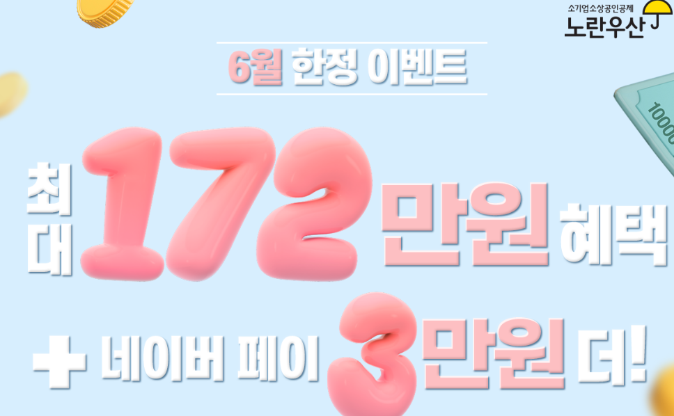 2024년 6월 까지만 노란우산 공제 가입 이벤트를 진행합니다. 최대 172만원의 혜택과 네이버 페이 3만원 쿠폰 증정 이벤트를 진행하고 있습니다. 노란우산 홈페이지와 어플을 통해 가입한 신규 가입자 전원에게 드리는 혜택입니다.